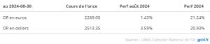 Le mois a été marqué par de nouveaux plus hauts historiques atteints en séances, à 2531 dollars dans la journée du 20 aout, et à 2282 euros dans la séance du 29 aout.