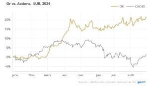 Sur le mois d’août, le CAC 40 a progressé de 1.32%, sensiblement comme le métal jaune. Néanmoins depuis le début de l’année, l’appréciation de l’indice parisien atteint seulement 1.27%, soit presque 20 points de moins que l’appréciation de l’once.
