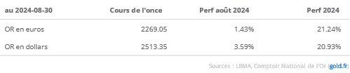 Le mois a été marqué par de nouveaux plus hauts historiques atteints en séances, à 2531 dollars dans la journée du 20 aout, et à 2282 euros dans la séance du 29 aout.