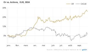 Le métal jaune fait largement mieux que le CAC40 qui est resté à l’équilibre en septembre (+0.06%). Même constat sur 2024 puisque l’indice parisien ne s’est apprécié que de 1.3%. Il faut remonter à 2010 pour trouver un tel écart de performance : cette année-là le métal jaune s’était apprécié de 37.7%, et le CAC avait reculé de 2.2%.