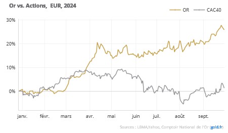 Le métal jaune fait largement mieux que le CAC40 qui est resté à l’équilibre en septembre (+0.06%). Même constat sur 2024 puisque l’indice parisien ne s’est apprécié que de 1.3%. Il faut remonter à 2010 pour trouver un tel écart de performance : cette année-là le métal jaune s’était apprécié de 37.7%, et le CAC avait reculé de 2.2%.