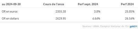 Les records ont été atteints le 26 septembre, avec des niveaux en journée dépassant les 2680 dollars. En euro, un nouveau record intraday a été atteint le 4 octobre, à 2430 euros l’once.