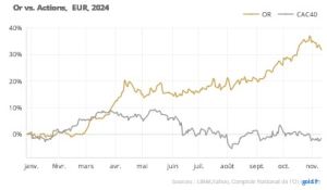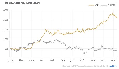 Entre fin octobre et la clôture du 11 novembre, le cours du métal jaune a reculé de 2%, ce qui ramène la performance 2024 à +31.7%. Le maché des actions, s’il a rebondi, reste en territoire négatif : l’indice parisien perd toujours 1.4% depuis le début de l’année.