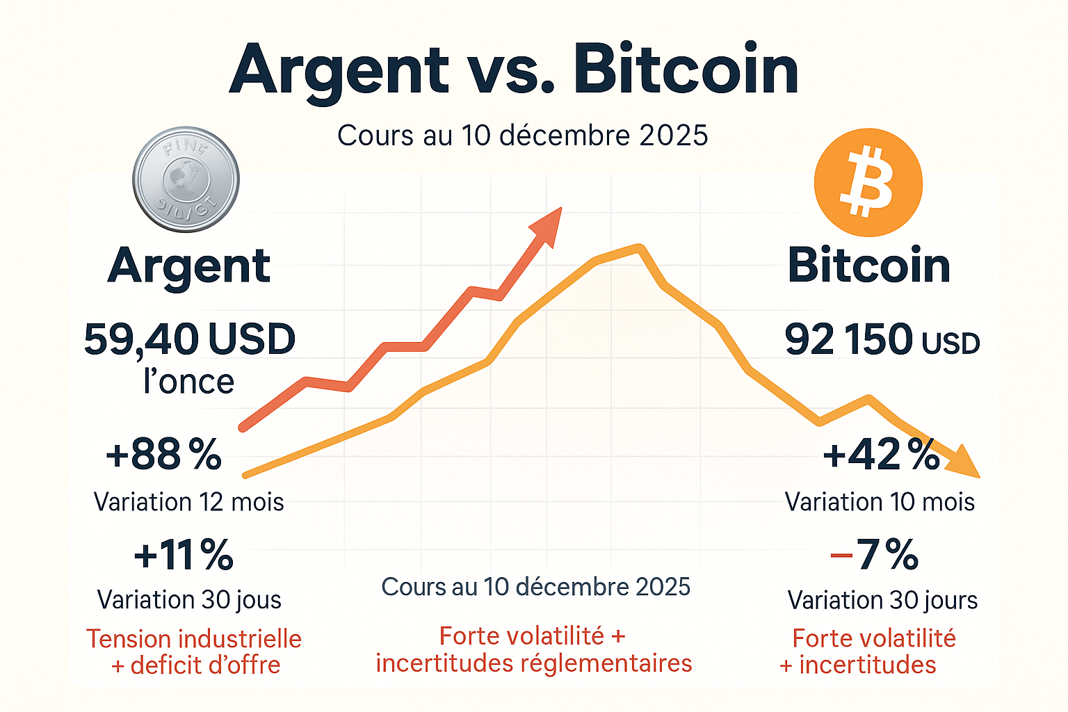 L’argent métal connaît en décembre 2025 un regain spectaculaire : l’once dépasse les 58-60 USD depuis plusieurs semaines. En parallèle, le Bitcoin reste extrêmement volatile : début décembre, son cours tourne autour de 92 000 USD. Face à ces deux options, l’argent pourrait bien offrir un profil spéculatif plus stable — ou du moins plus tangible.