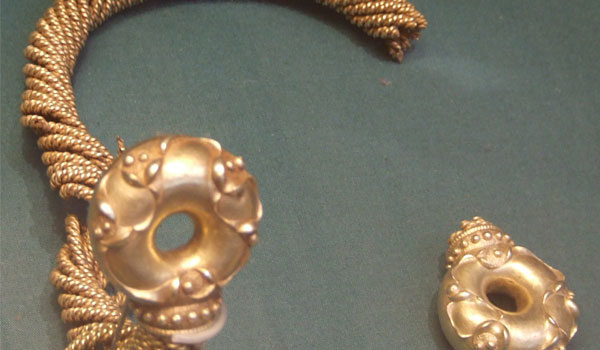 Ce collier celtique en matériau précieux datant de l'âge du fer, a été retrouvé brisé dans un champ près du…